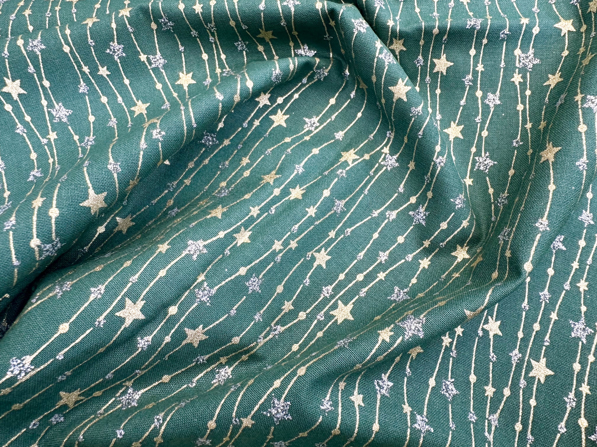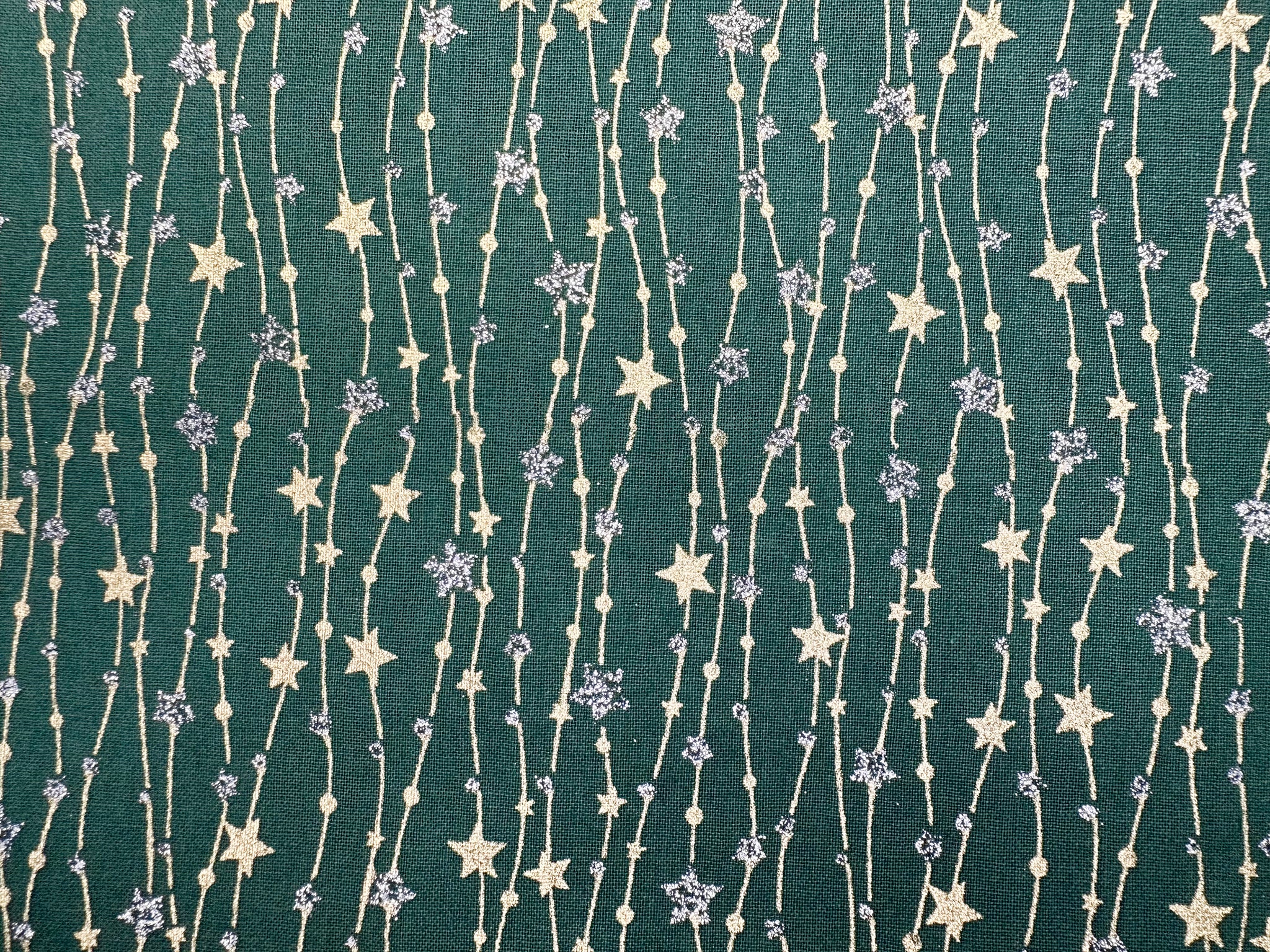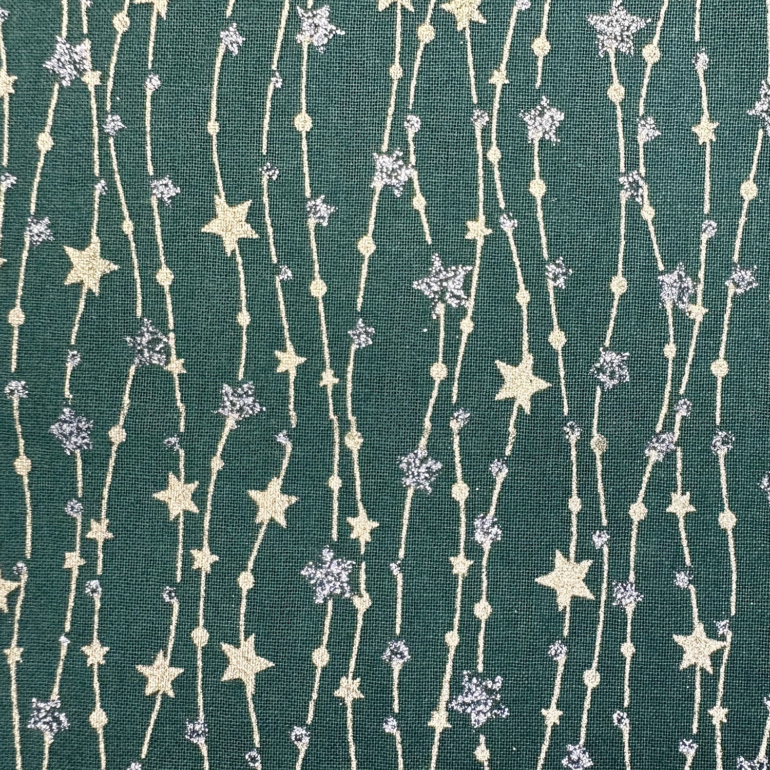 Christmas Fabric - Silver & Gold Glitter Stars on Green - 100% Cotton Fabric
