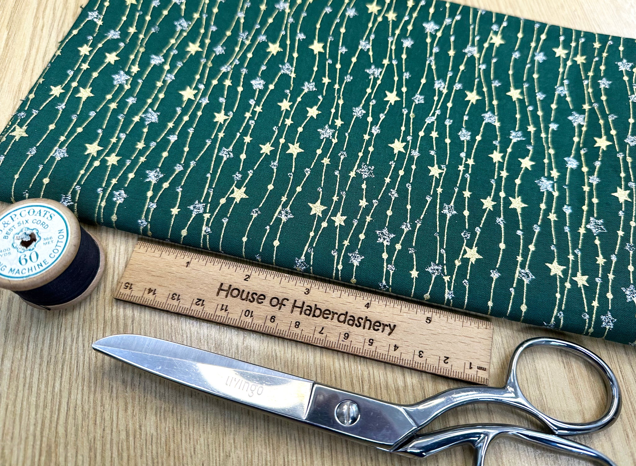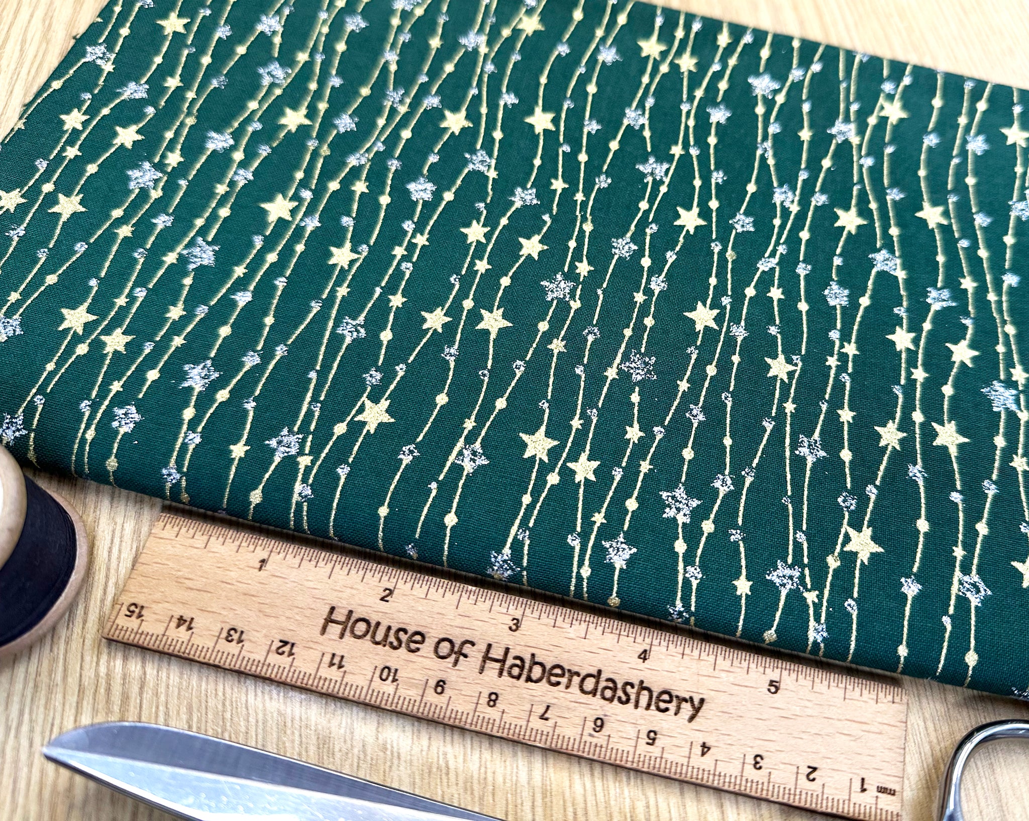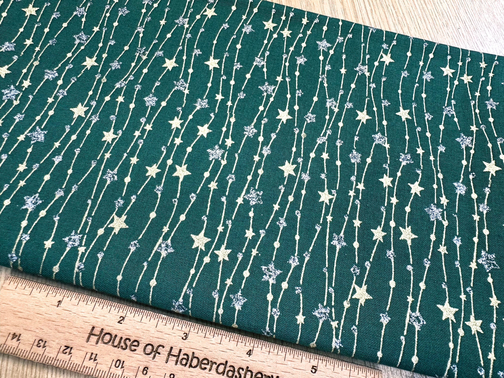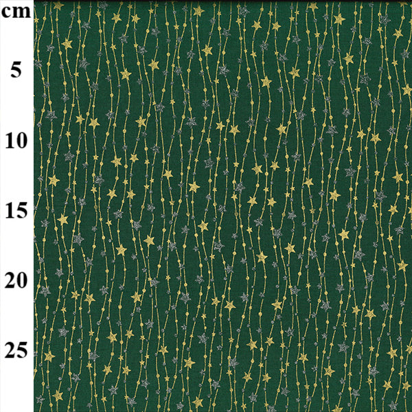 Christmas Fabric - Silver & Gold Glitter Stars on Green - 100% Cotton Fabric