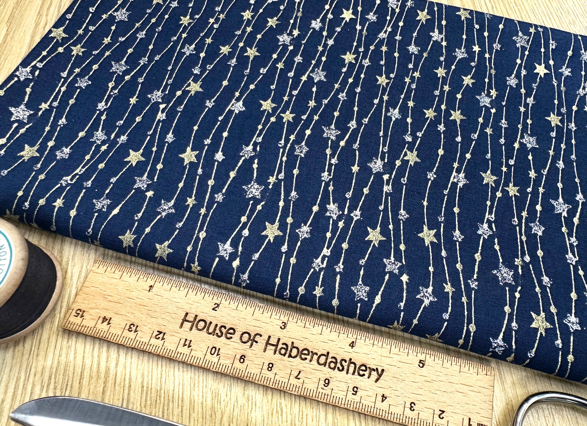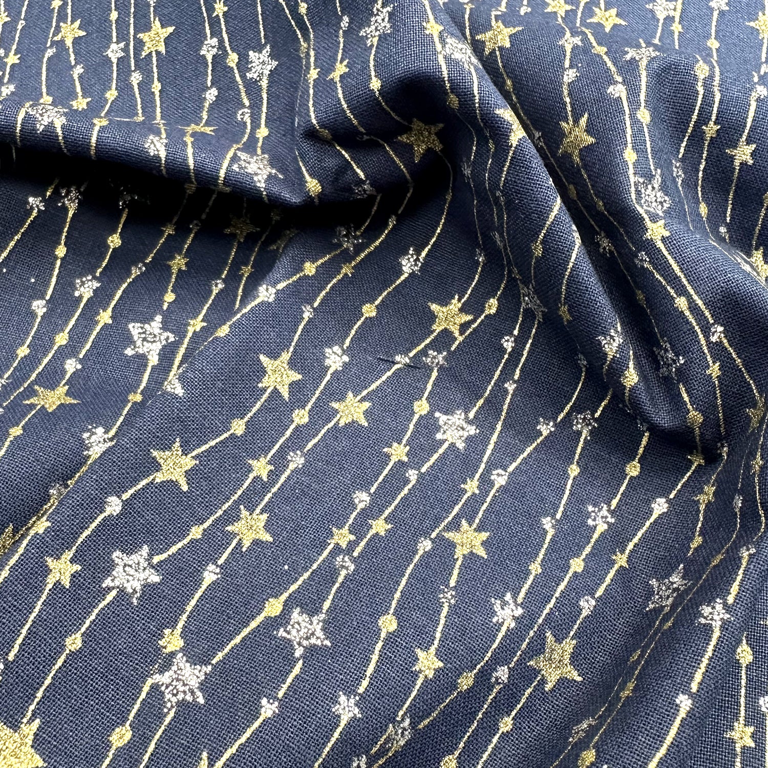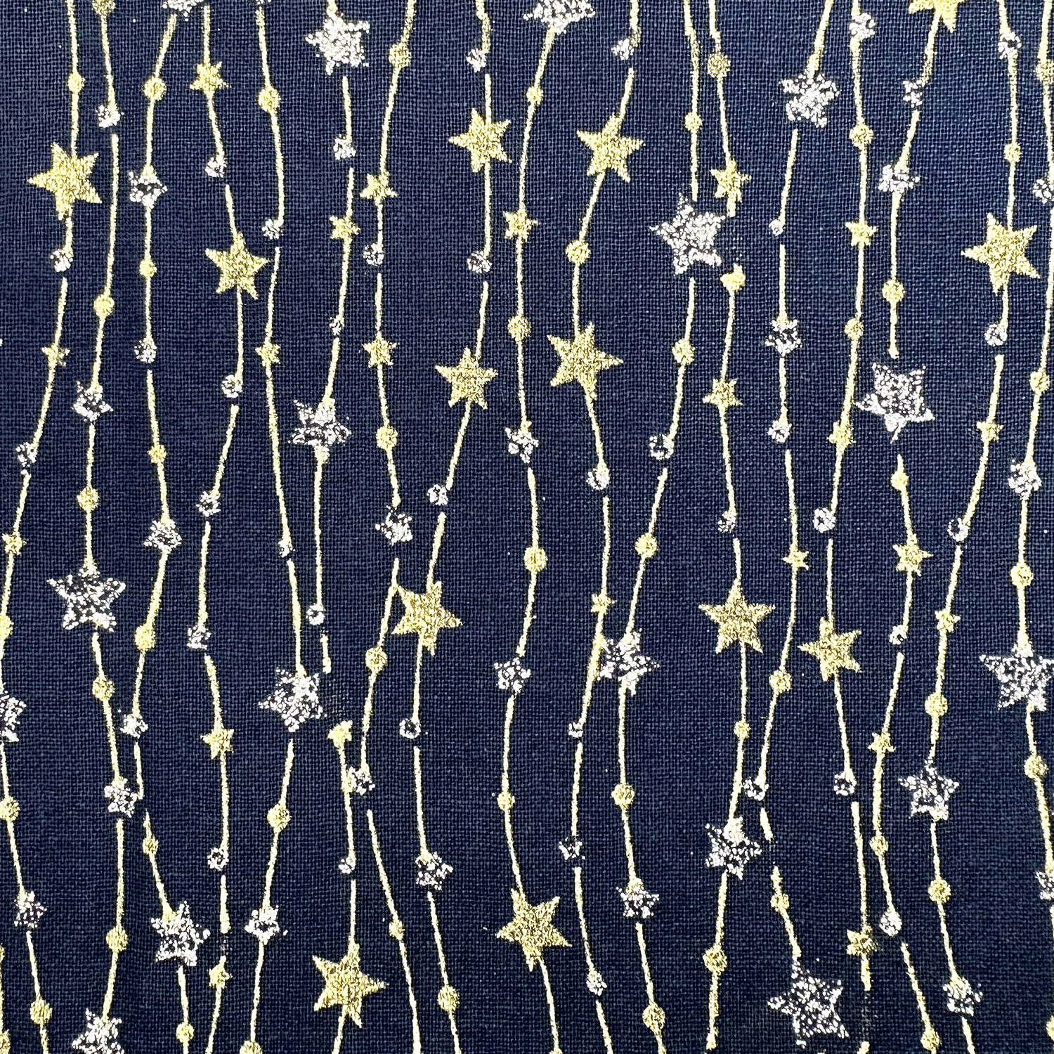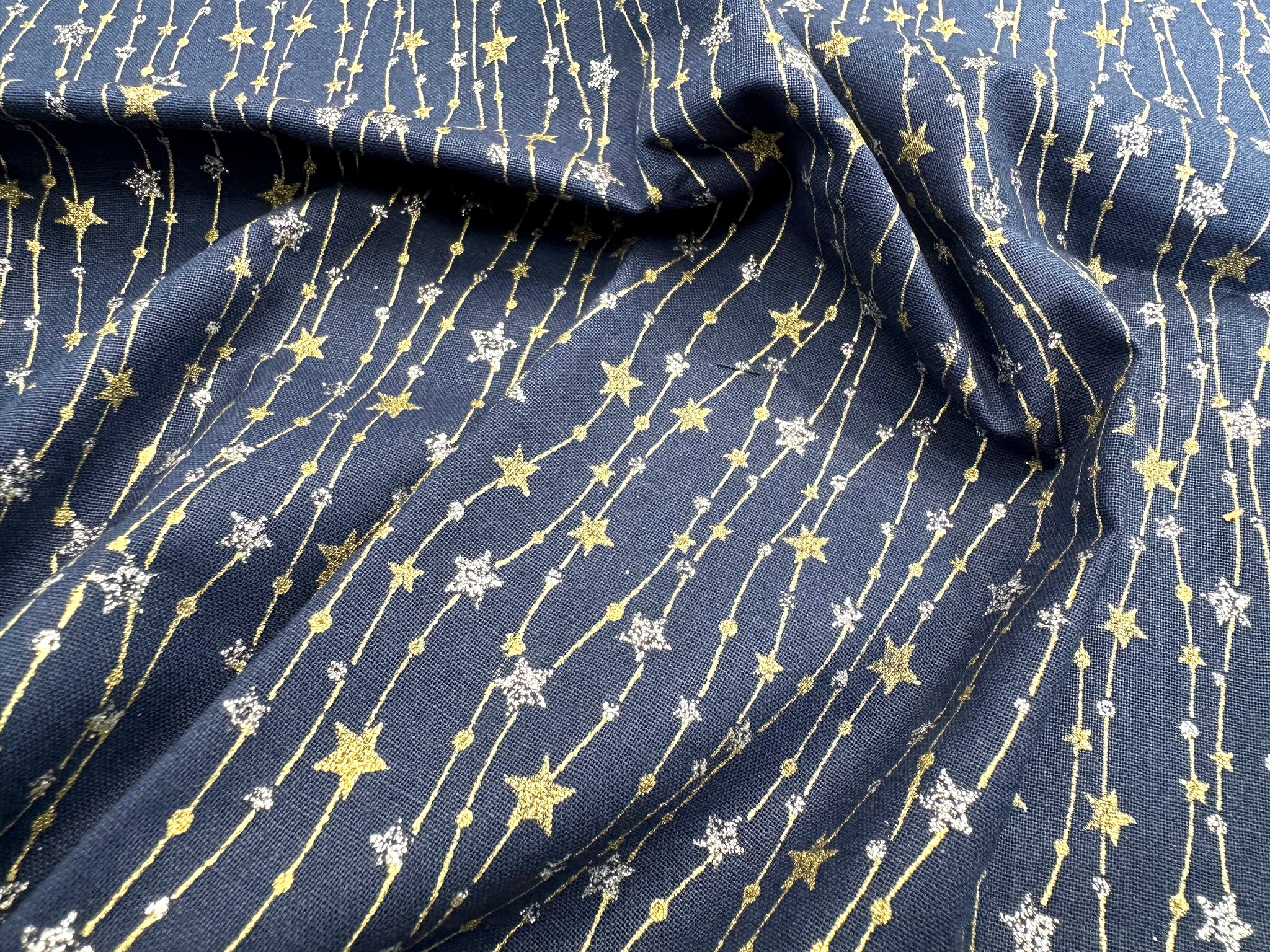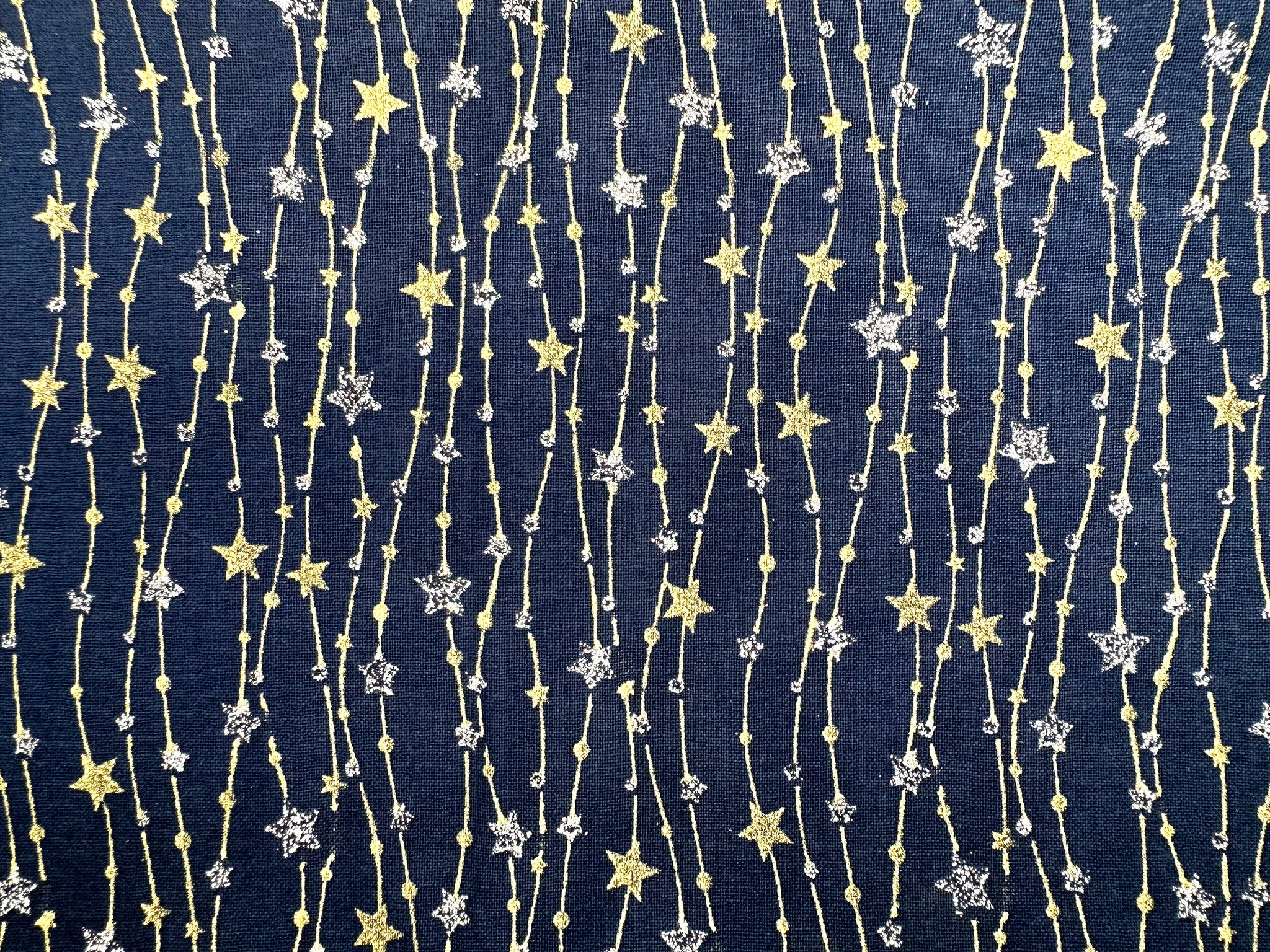 Christmas Fabric - Silver & Gold Glitter Stars on Navy Blue - Cotton Fabric