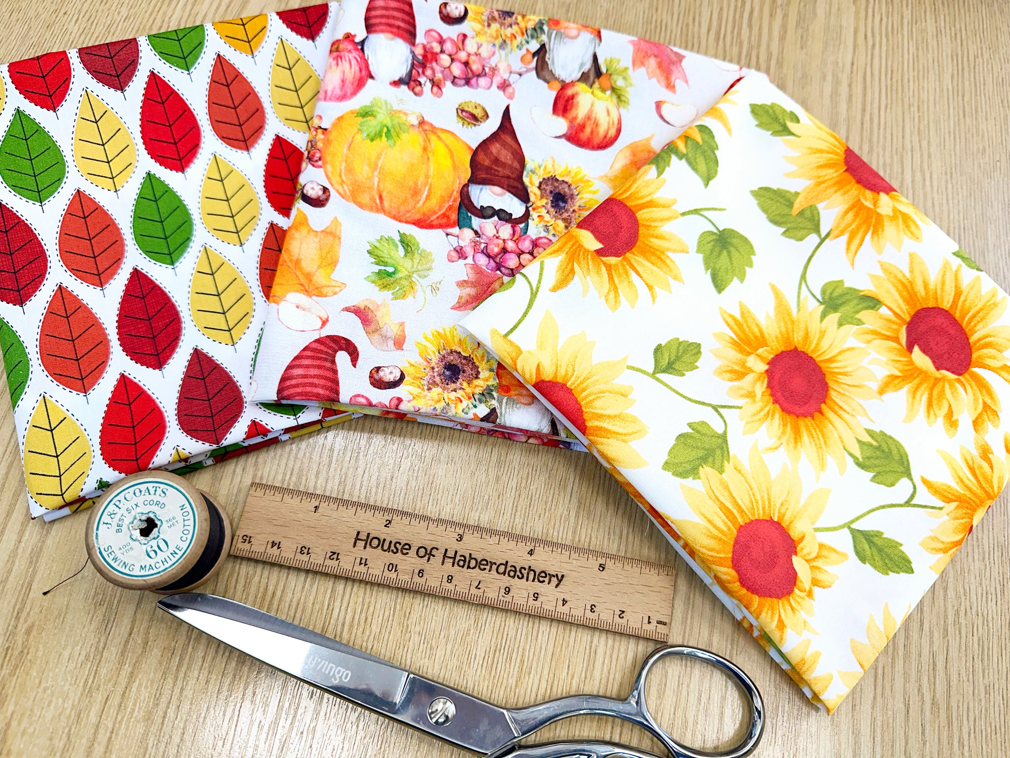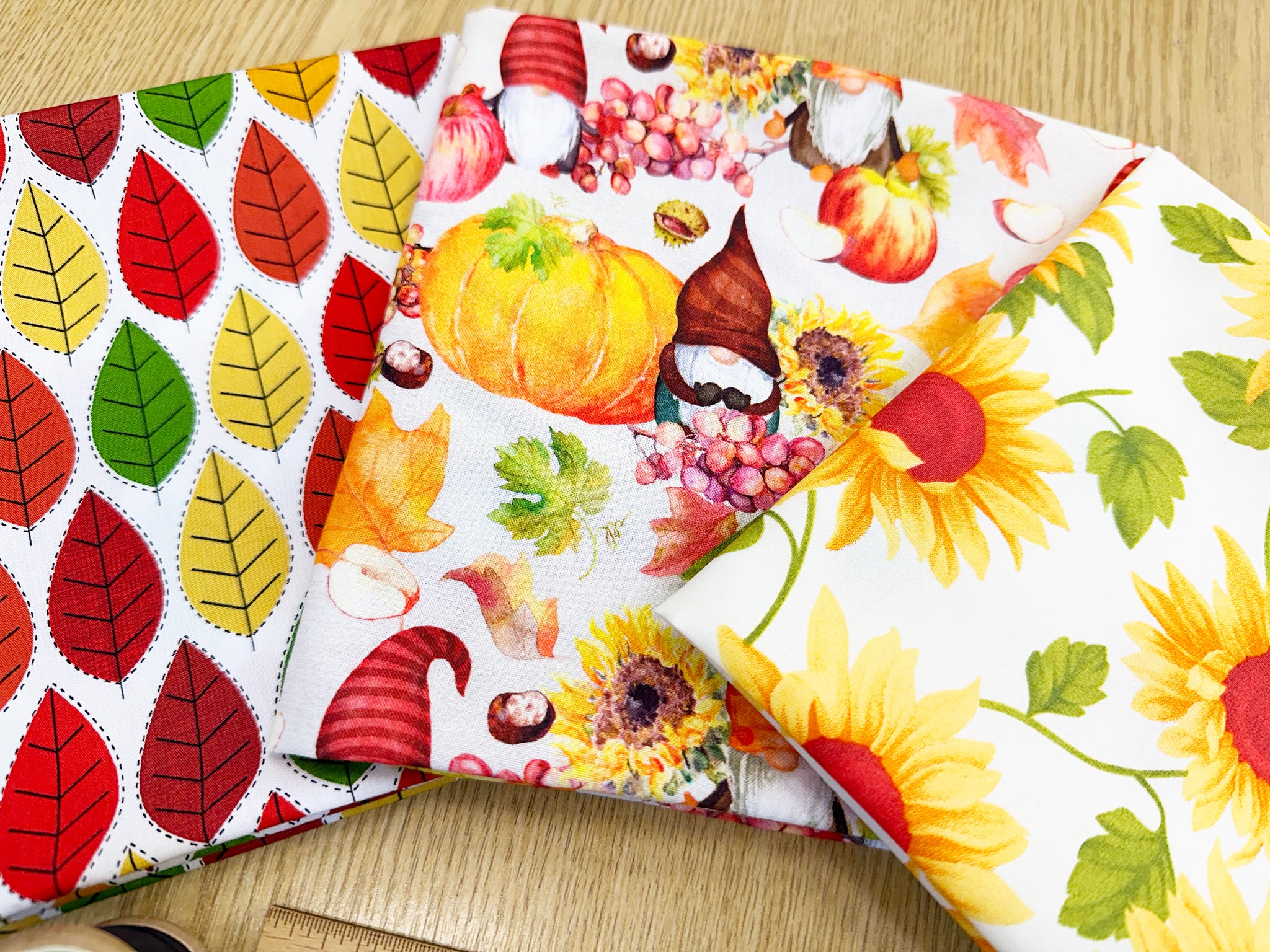 Fat Quarter Fabric Bundle - Autumn Gonks Sunflowers & Leaves Mix - 3 Piece Bundle